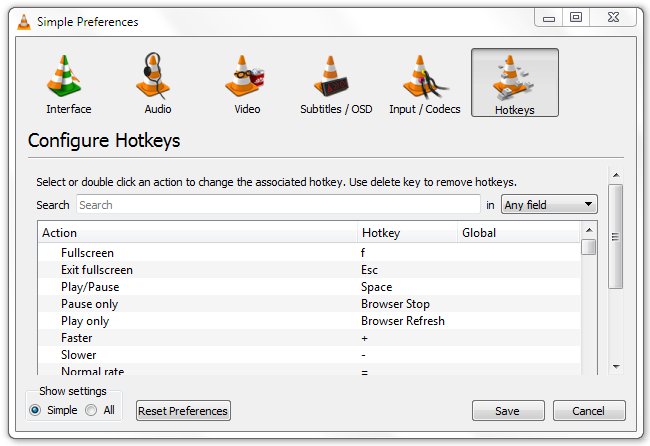 PreferencesHộp thoại VLC . Nhấn Ctrl+ P và chọn phím tắt mong muốn.