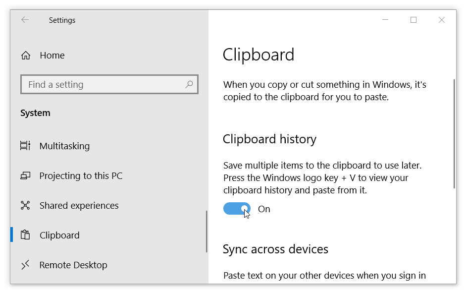 Trong Cài đặt khay nhớ tạm, chuyển “ Clipboard History ” thành ON.