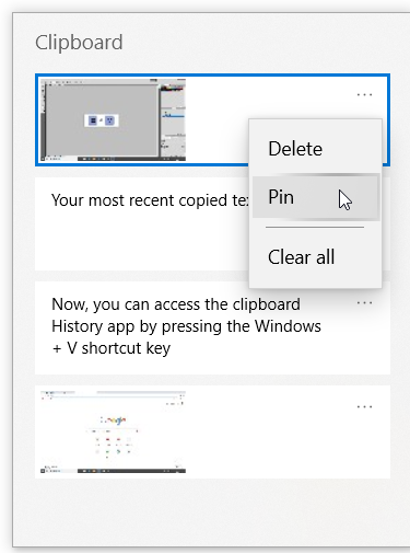Mỗi mục nhập Clipboard có một menu ba chấm ở góc trên cùng bên phải. Bạn có thể sử dụng menu để xóa bất kỳ mục nào trong danh sách. Bạn cũng có thể ghim-pin một mục nhập clipboard và nó sẽ vẫn ở đó giống như một ghi chú dính ngay cả khi bạn khởi động lại PC của mình.