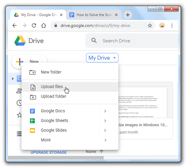 Tải tệp Word của bạn lên Google Drive bằng cách nhấp vào My Drive và chọn Upload Files từ menu thả xuống.