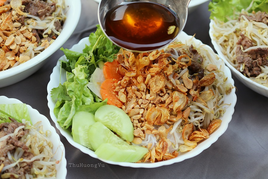 - Khi ăn xếp các nguyên liệu rau thơm, giá đỗ, dưa chuột cà rốt, cùng thịt bò xào vào bát cùng bún tươi, rắc lạc rang và hành phi lên trên rồi chan nước mắm.