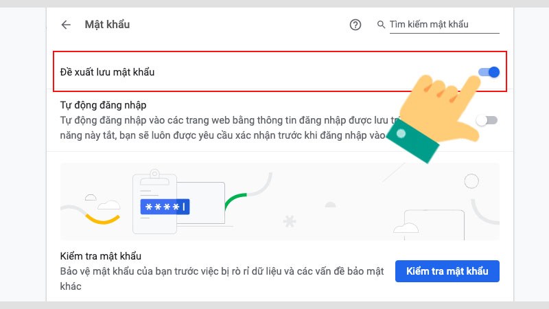 Bước 3: Đề xuất lưu mật khẩu. Kéo thanh công cụ sang trái để tắt chế độ đề xuất lưu hoặc sang phải để bật.