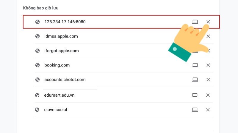 Bước 4: Nếu bạn chọn nhầm không bao giờ lưu mật khẩu cho trang web này. Để hoàn tác bạn kéo xuống mục không bao giờ lưu, chọn dấu X ngay trang web bạn muốn.