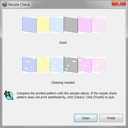 Còn trường hợp máy in bị sọc như phần dưới thì chúng ta phải Cleaning để làm đều mực lại. Chọn nút Clean và chọn Start. Máy sẽ tự động làm đều mực lại, quá trình này sẽ mất khoảng ít phút.