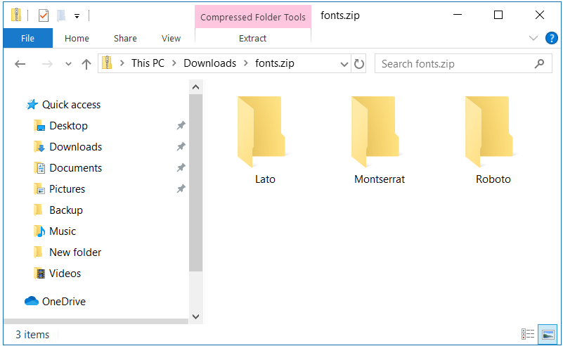 Các họ phông chữ sẽ được tải xuống PC của bạn dưới dạng tệp zip . Bạn có thể giải nén tệp zip. Các tệp phông chữ có sẵn ở định dạng .ttf .