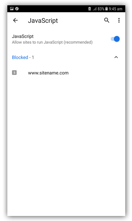 Bây giờ hãy bật lại JavaScript cho tất cả các trang web. Cài đặt cuối cùng của bạn sẽ trông như được hiển thị bên dưới với JavaScript bị chặn cho trang web mà bạn mong muốn.