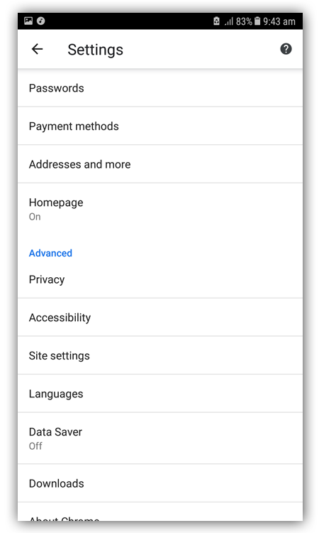 Mở Trình duyệt Google Chrome trên thiết bị của bạn. Mở Settings và chọn Site Settings trong Advanced.