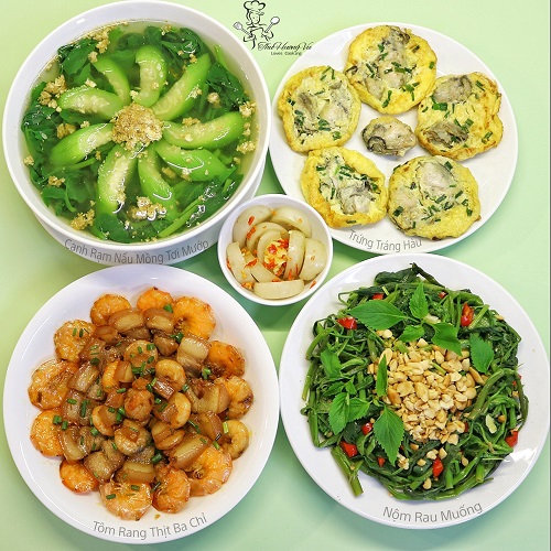 Cơm hè mình chỉ bát canh cua mồng tơi với bát cà dầm là hết bát cơm. Còn những món mặn là nấu cho ck con ăn.