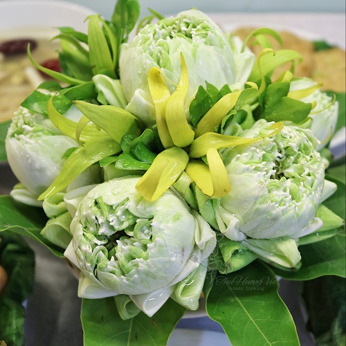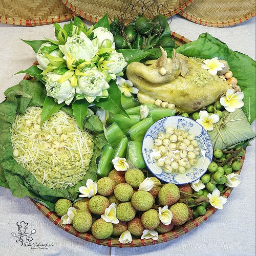 Mâm lễ mừng 1 tháng 4 âm lịch kết hợp hoa quả và ngũ cốc theo mùa của người Việt gồm Hoa sen trắng kết hợp hoa lan Vàng, Gà hấp hạt sen, Cốm (chế biến từ hạt lúa non), Quả vải tươi..