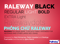 Phông chữ Raleway là một họ kiểu chữ sans-serif dành cho các tiêu đề và cách sử dụng phông chữ kích thước lớn khác. Ban đầu được thiết kế bởi Matt McInerney, nó được mở rộng thành 9 weight family bởi Rodrigo Fuenzalida và Pablo Impallari vào năm 2012 và iKerned bởi Igino Marini.